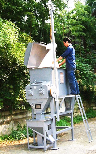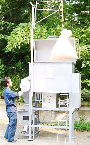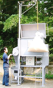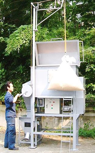 小型定量装置は、手動巻き上げ装置で200Kg迄軽く持ち上げられ、オバQ袋投入ができます。